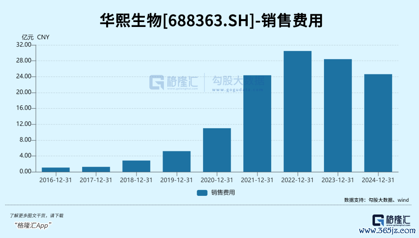 最新财报中,华熙生物的各项销售、研发和管理费用总计超过35亿元,占到了总营收的66.8%。其中销售费用在2024年已经同比减少,但销售费用率仍高达45.88%。