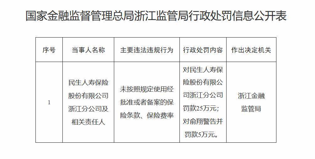 7月21日,据浙江金融监管局行政处罚信息公开表显示,民生人寿保险股份有限公司浙江分公司因未按照规定使用经批准或者备案的保险条款、保险费率被罚款25万元。同时,俞翔因未按照规定使用经批准或者备案的保险条款、保险费率厦门股票配资开户,被警告并罚款5万元。
